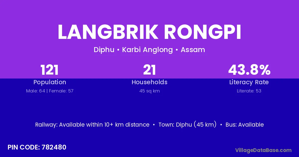 Diphu (45 km) is the nearest town to Langbrik Rongpi village for major economic activities and is located approximately 45 km away.