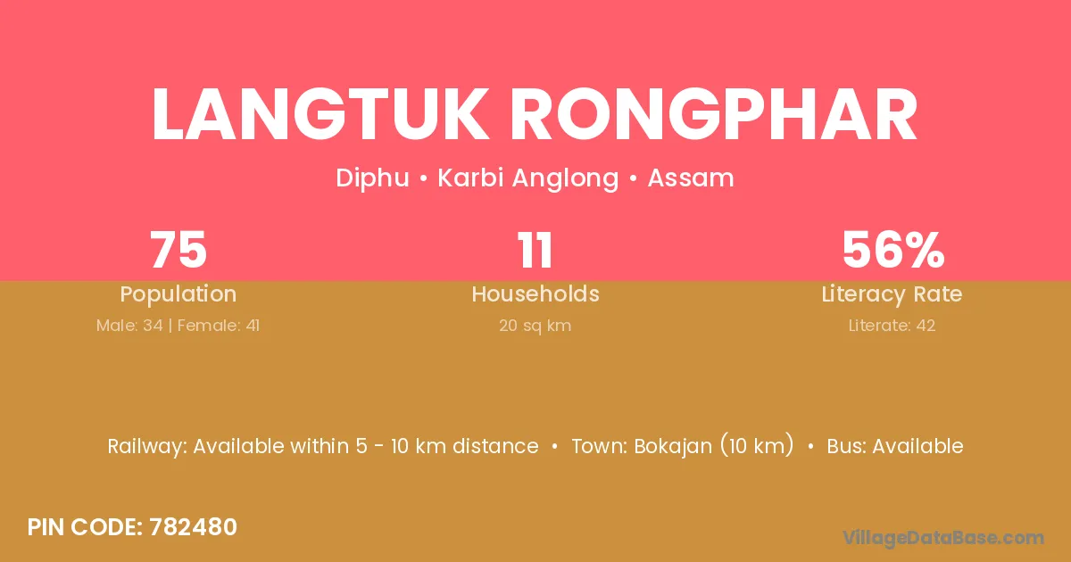 Bokajan (10 km) is the nearest town to Langtuk Rongphar village for major economic activities and is located approximately 10 km away.