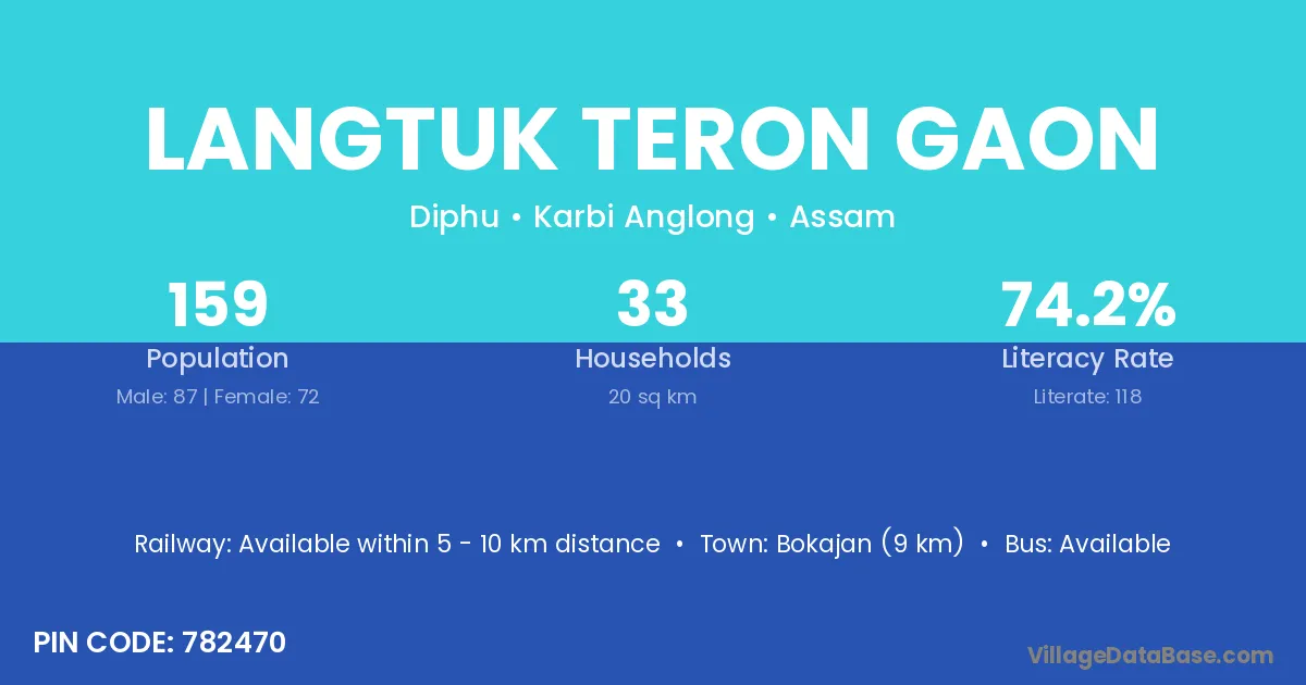 Bokajan (9 km) is the nearest town to Langtuk Teron Gaon village for major economic activities and is located approximately 9 km away.