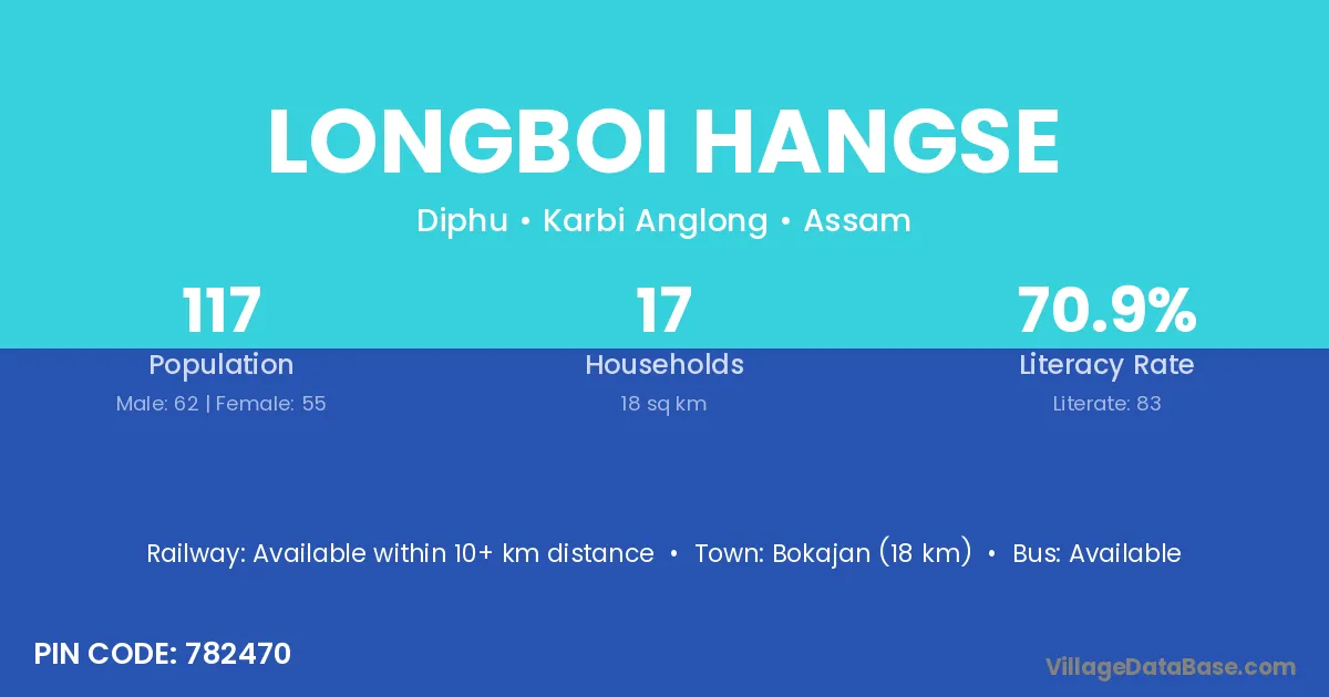 Bokajan (18 km) is the nearest town to Longboi Hangse village for major economic activities and is located approximately 18 km away.