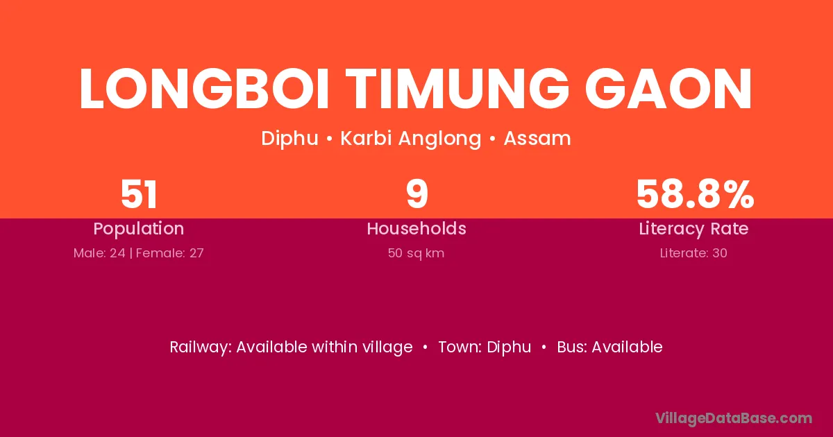 Longboi Timung Gaon village has a total population of 51 people, of which 24 are males and 27 are females.