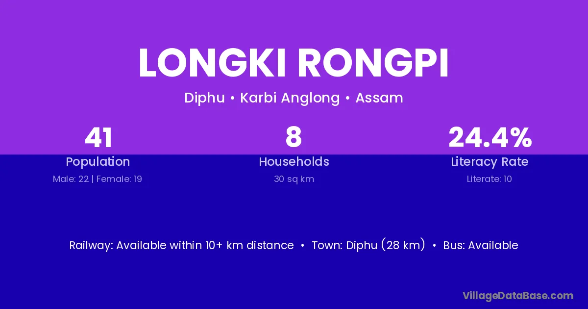 Diphu (28 km) is the nearest town to Longki Rongpi village for major economic activities and is located approximately 28 km away.