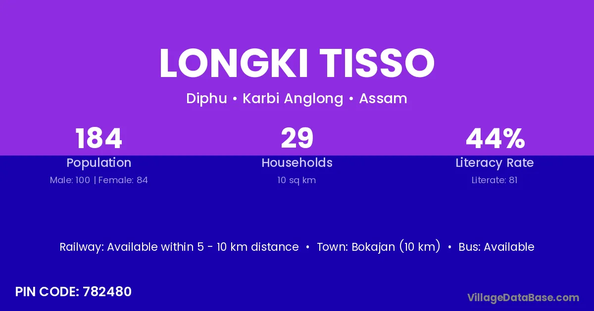 Bokajan (10 km) is the nearest town to Longki Tisso village for major economic activities and is located approximately 10 km away.