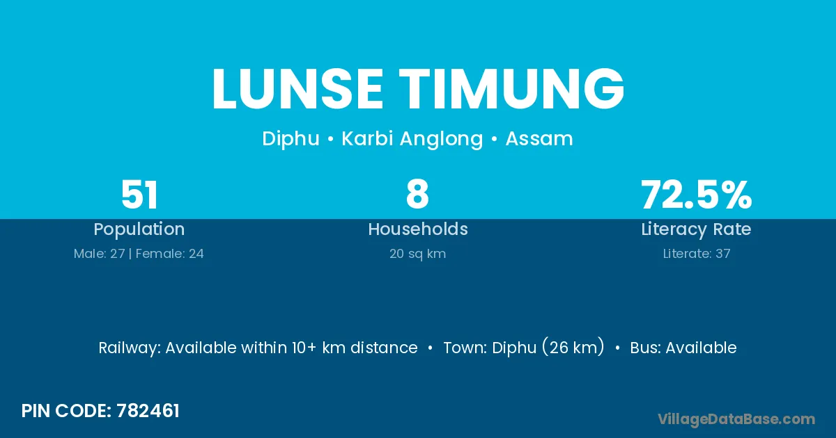 Diphu (26 km) is the nearest town to Lunse Timung village for major economic activities and is located approximately 26 km away.