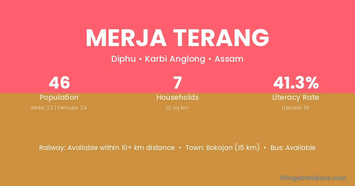 Bokajan (15 km) is the nearest town to Merja Terang village for major economic activities and is located approximately 15 km away.