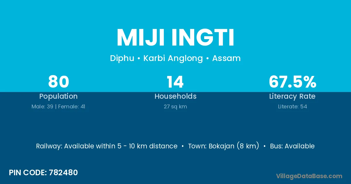 Bokajan (8 km) is the nearest town to Miji Ingti village for major economic activities and is located approximately 8 km away.