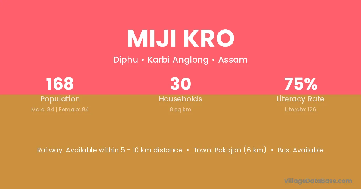 Bokajan (6 km) is the nearest town to Miji Kro village for major economic activities and is located approximately 6 km away.