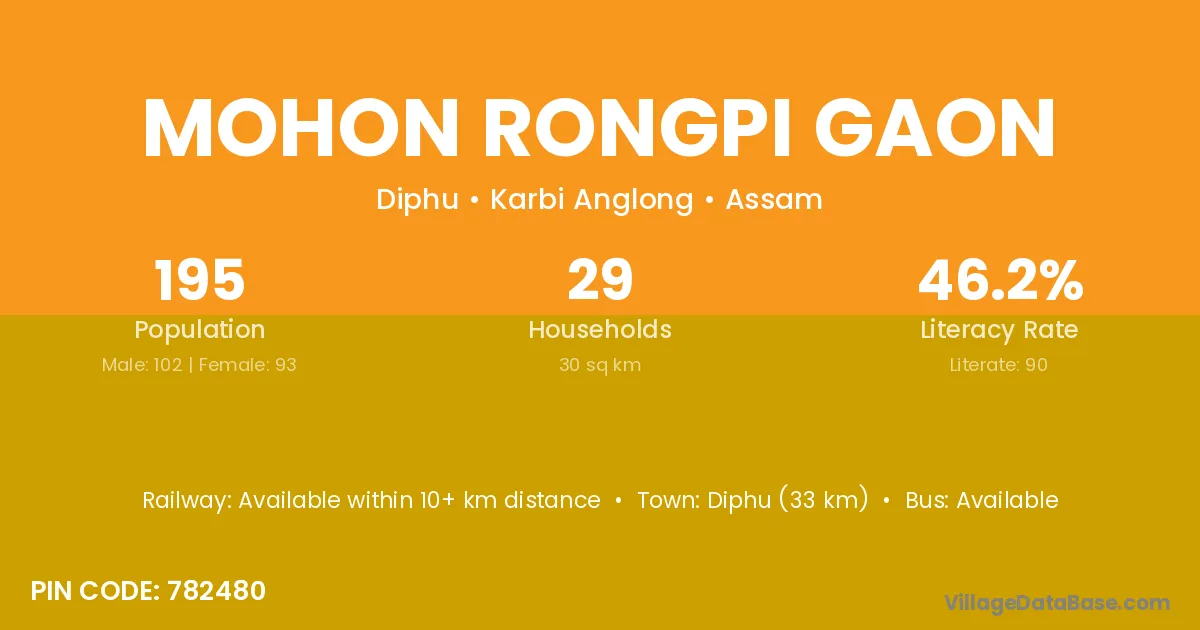 Diphu (33 km) is the nearest town to Mohon Rongpi Gaon village for major economic activities and is located approximately 33 km away.