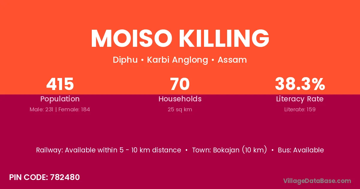 Moiso Killing village has a total population of 415 people, of which 231 are males and 184 are females.