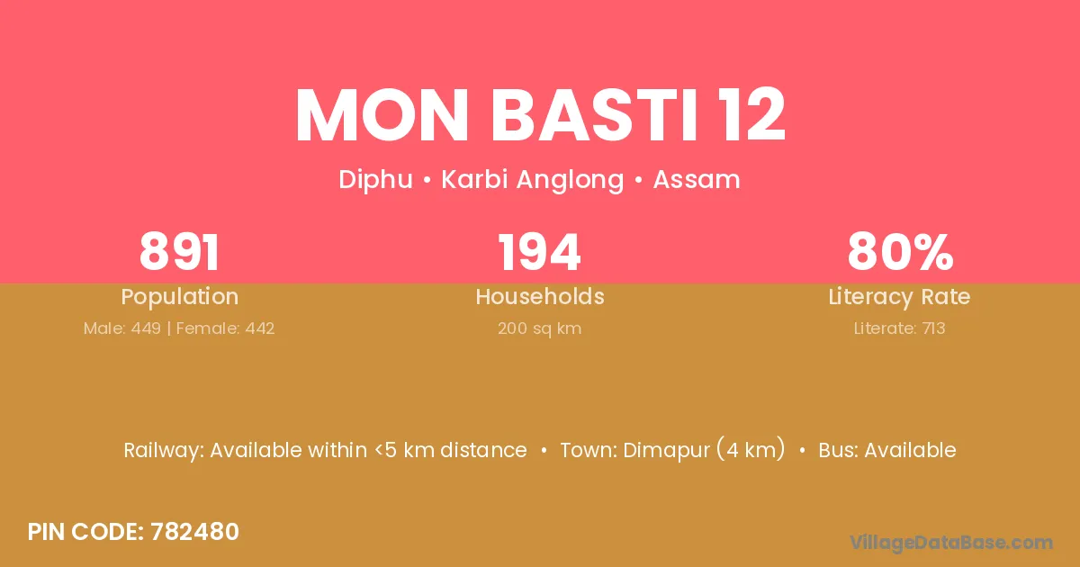 Dimapur (4 km) is the nearest town to Mon Basti 12 village for major economic activities and is located approximately 4 km away.