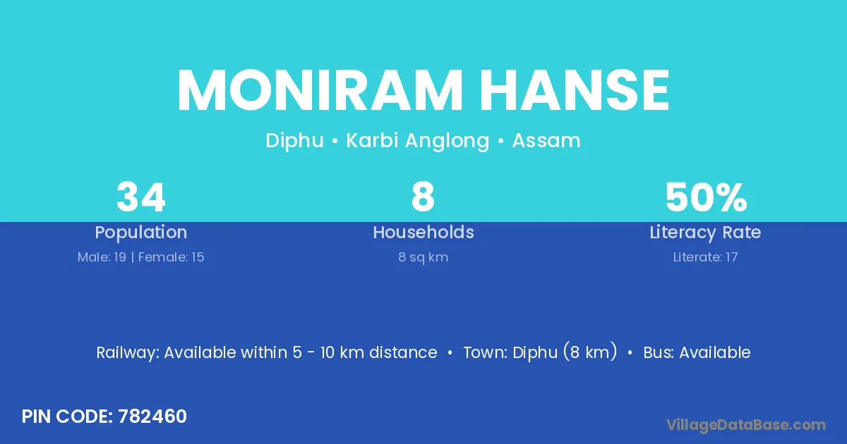 Diphu (8 km) is the nearest town to Moniram Hanse village for major economic activities and is located approximately 8 km away.