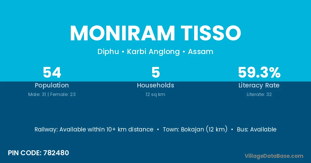 Bokajan (12 km) is the nearest town to Moniram Tisso village for major economic activities and is located approximately 12 km away.