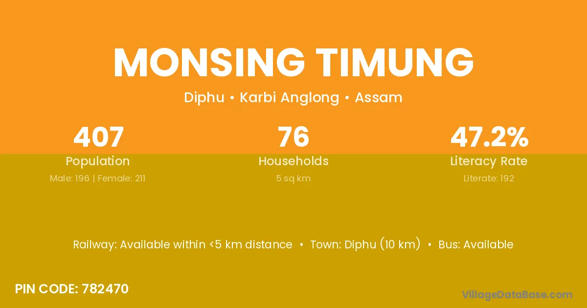 Diphu (10 km) is the nearest town to Monsing Timung village for major economic activities and is located approximately 10 km away.