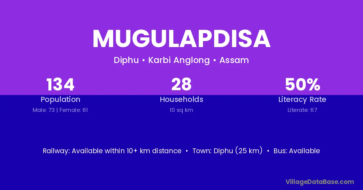 Diphu (25 km) is the nearest town to Mugulapdisa village for major economic activities and is located approximately 25 km away.