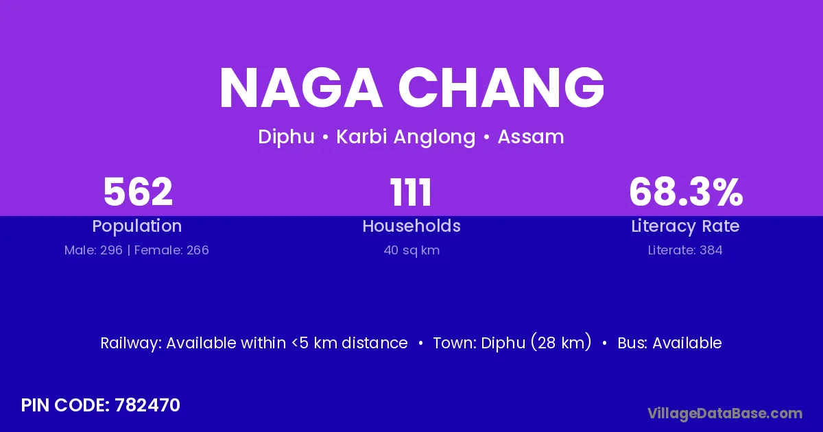Diphu (28 km) is the nearest town to Naga Chang village for major economic activities and is located approximately 28 km away.
