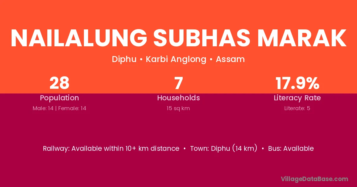 Diphu (14 km) is the nearest town to Nailalung Subhas Marak village for major economic activities and is located approximately 14 km away.