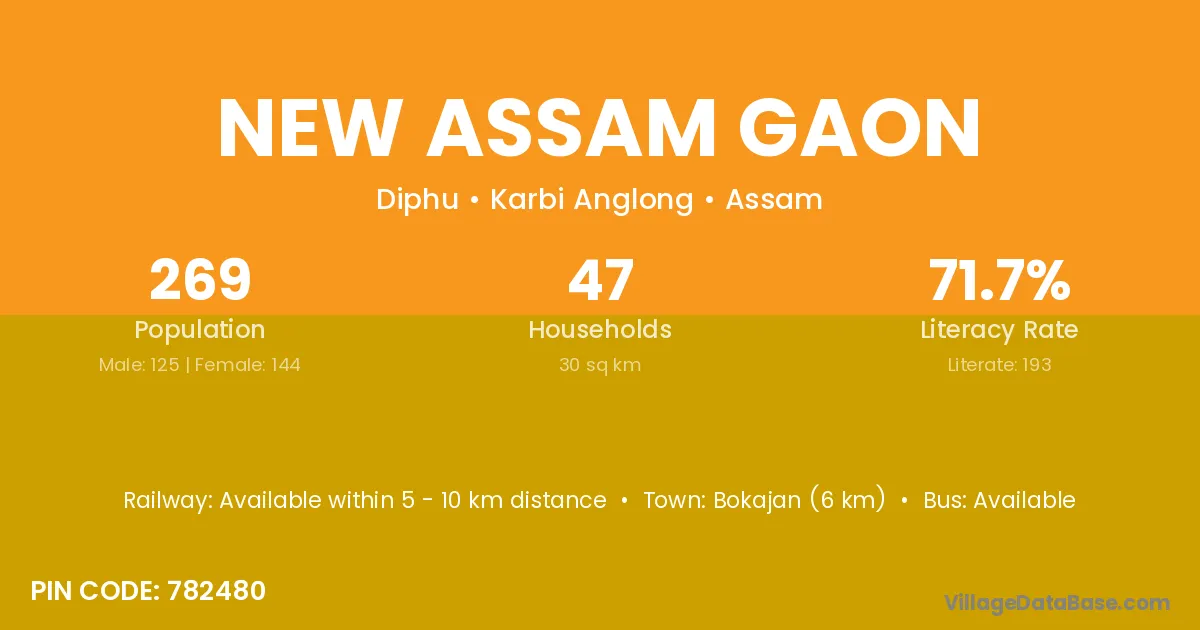 Bokajan (6 km) is the nearest town to New Assam Gaon village for major economic activities and is located approximately 6 km away.