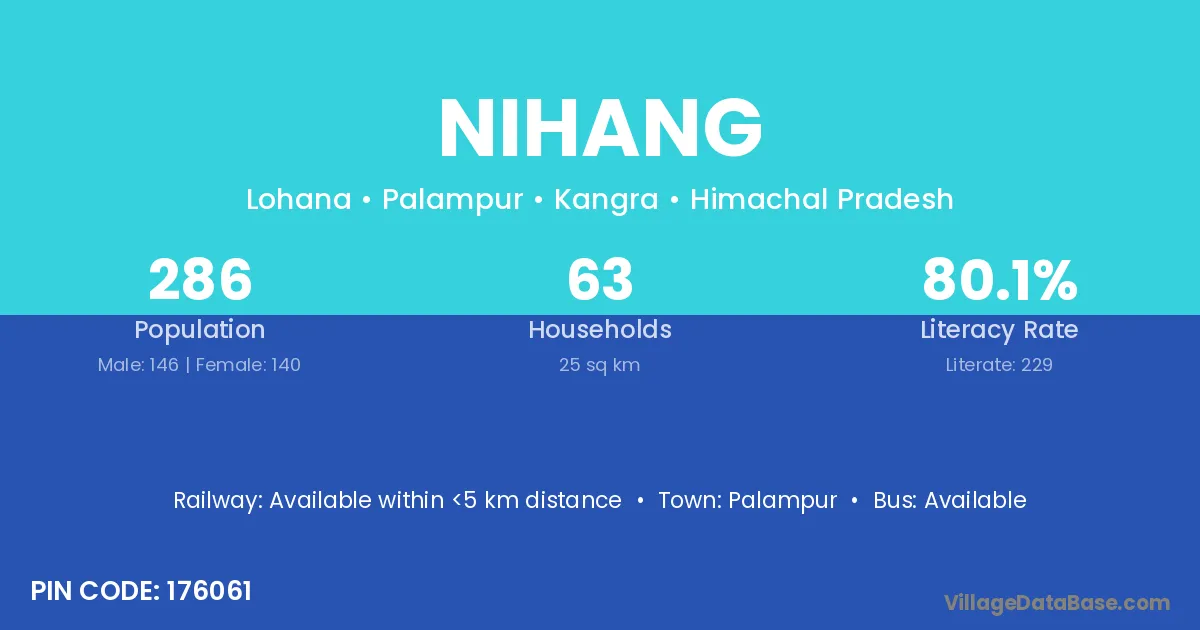 Nihang village has a total population of 111 people, of which 59 are males and 52 are females.
