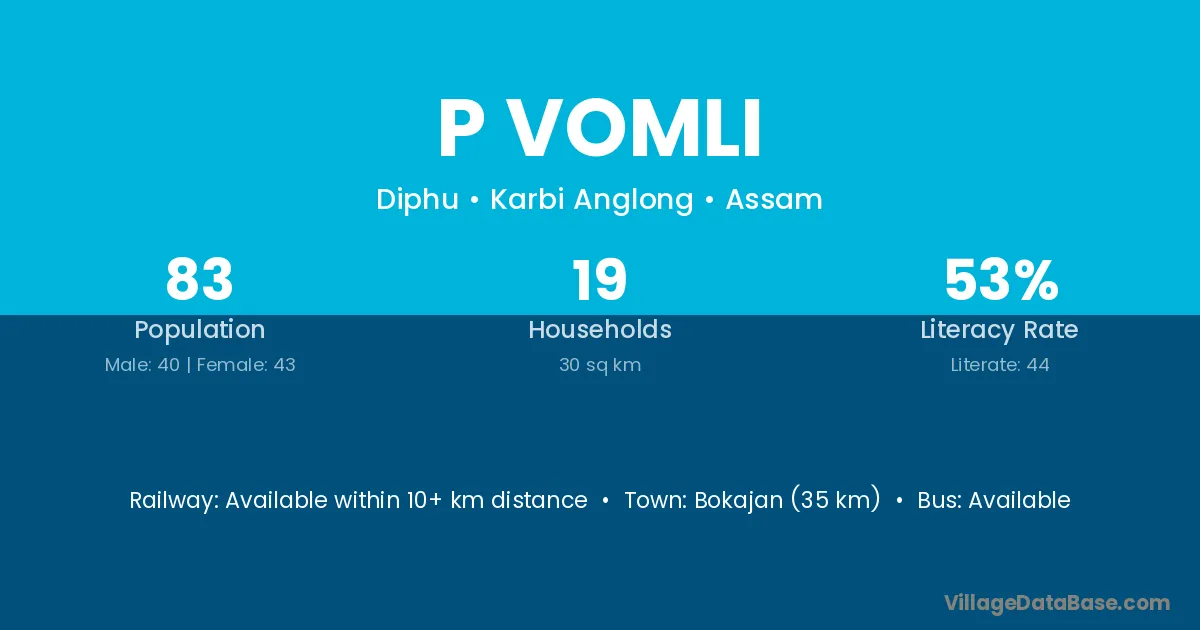 Bokajan (35 km) is the nearest town to P Vomli village for major economic activities and is located approximately 35 km away.