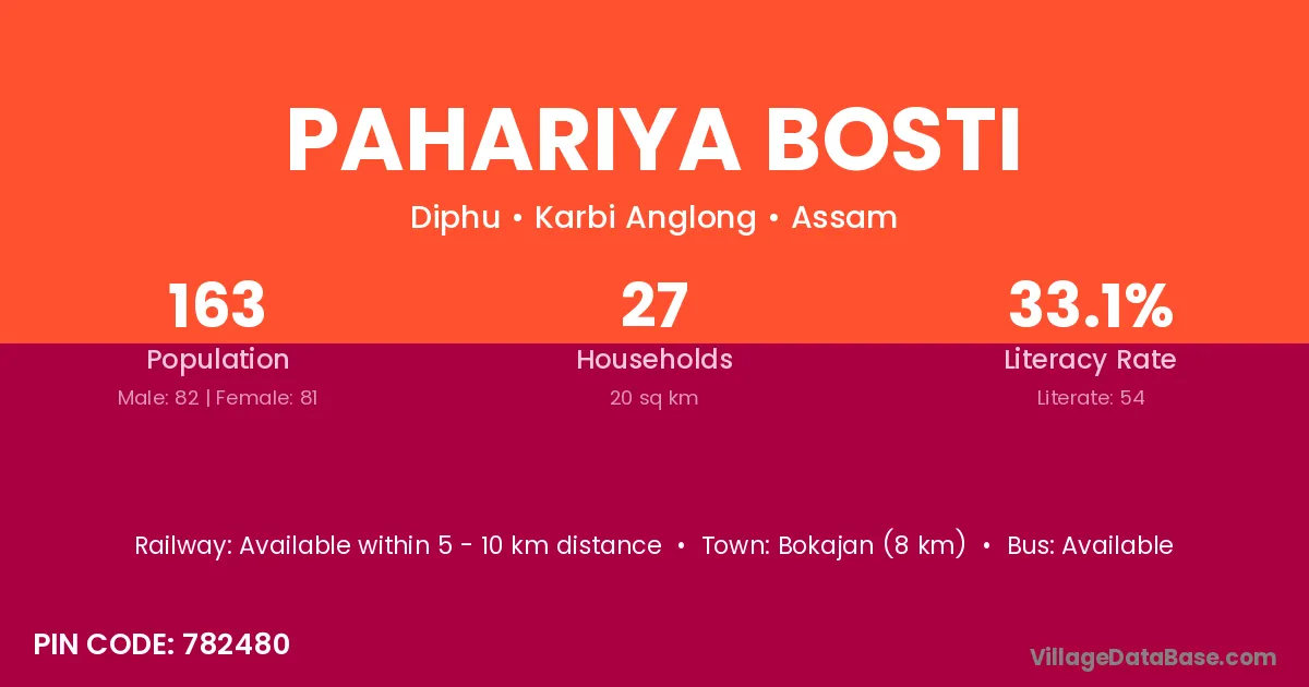 Bokajan (8 km) is the nearest town to Pahariya Bosti village for major economic activities and is located approximately 8 km away.