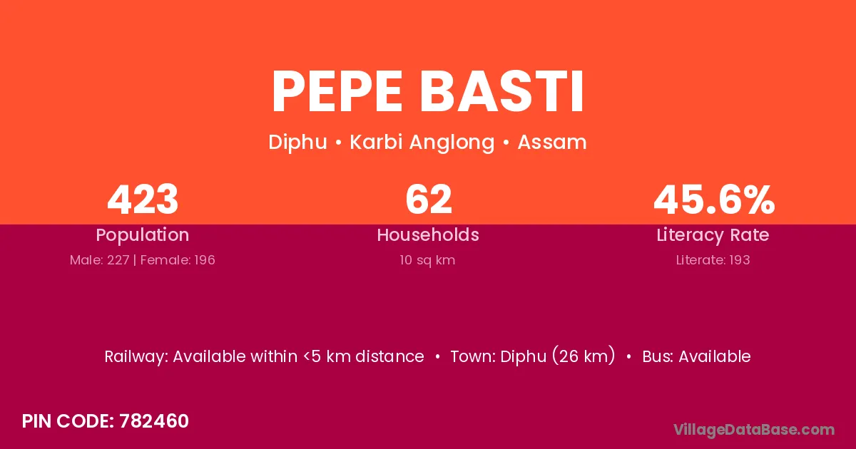 Diphu (26 km) is the nearest town to Pepe Basti village for major economic activities and is located approximately 26 km away.
