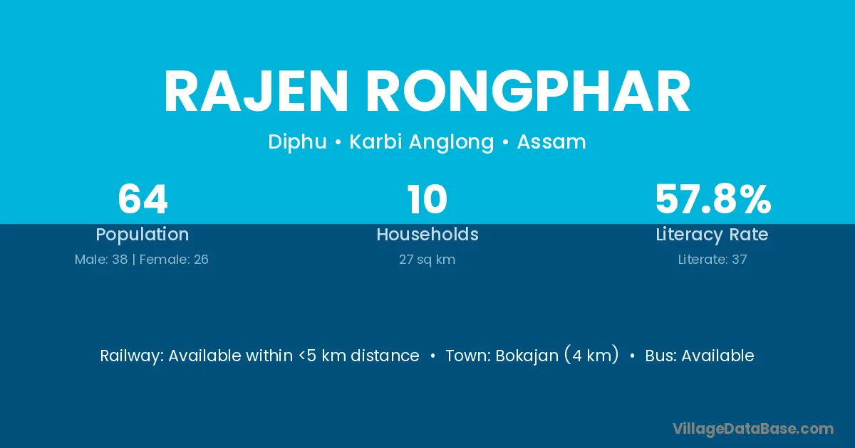 Bokajan (4 km) is the nearest town to Rajen Rongphar village for major economic activities and is located approximately 4 km away.