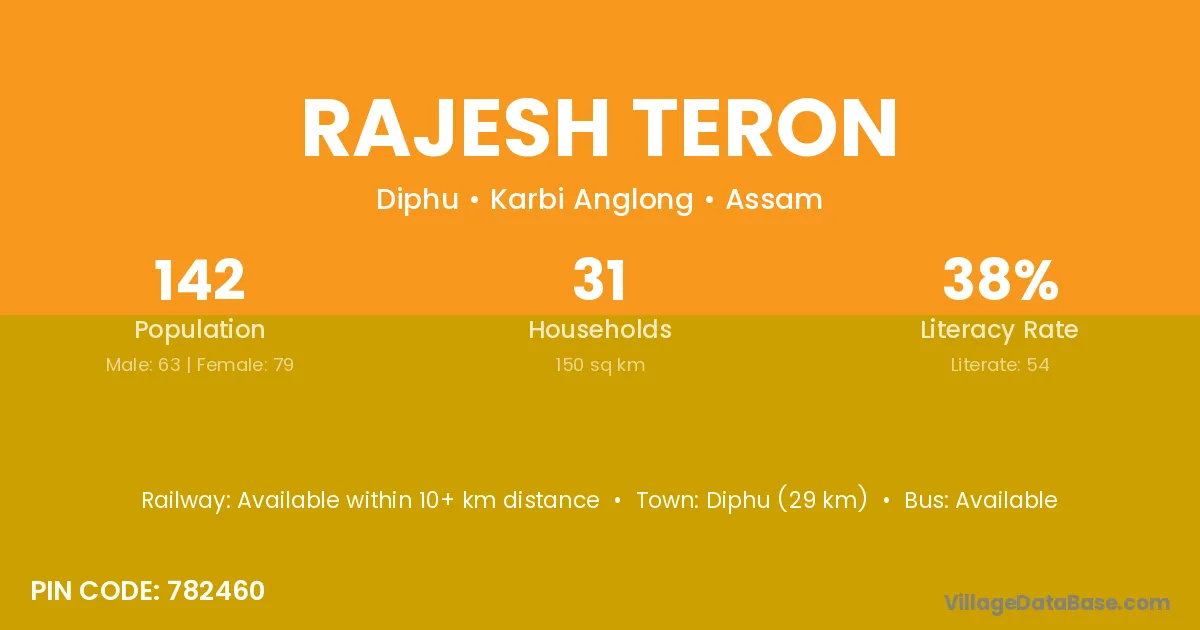 Diphu (29 km) is the nearest town to Rajesh Teron village for major economic activities and is located approximately 29 km away.