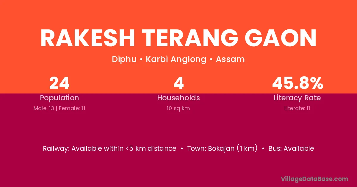 Bokajan (1 km) is the nearest town to Rakesh Terang Gaon village for major economic activities and is located approximately 1 km away.