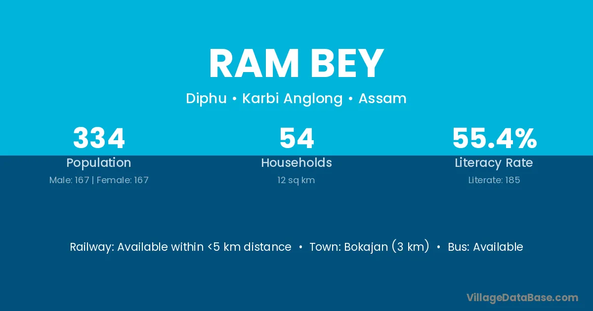 Bokajan (3 km) is the nearest town to Ram Bey village for major economic activities and is located approximately 3 km away.