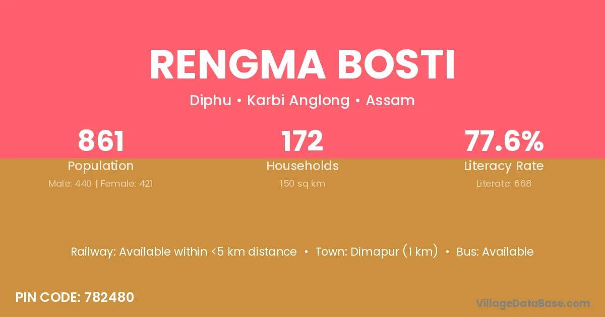 Dimapur (1 km) is the nearest town to Rengma Bosti village for major economic activities and is located approximately 1 km away.