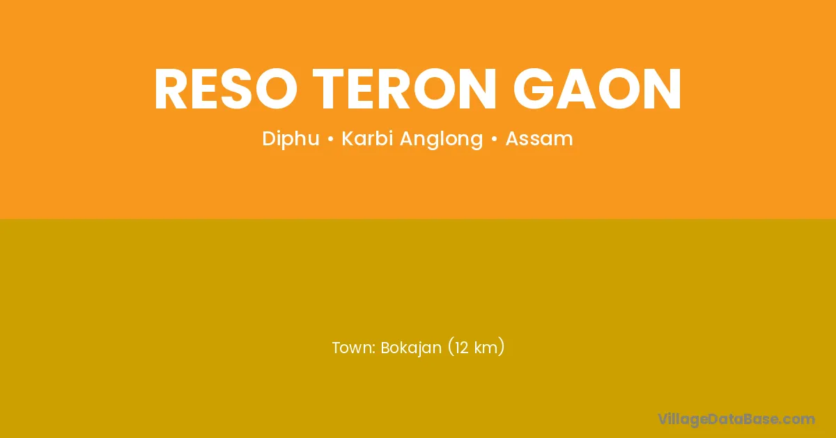 Bokajan (12 km) is the nearest town to Reso Teron Gaon village for major economic activities and is located approximately 12 km away.
