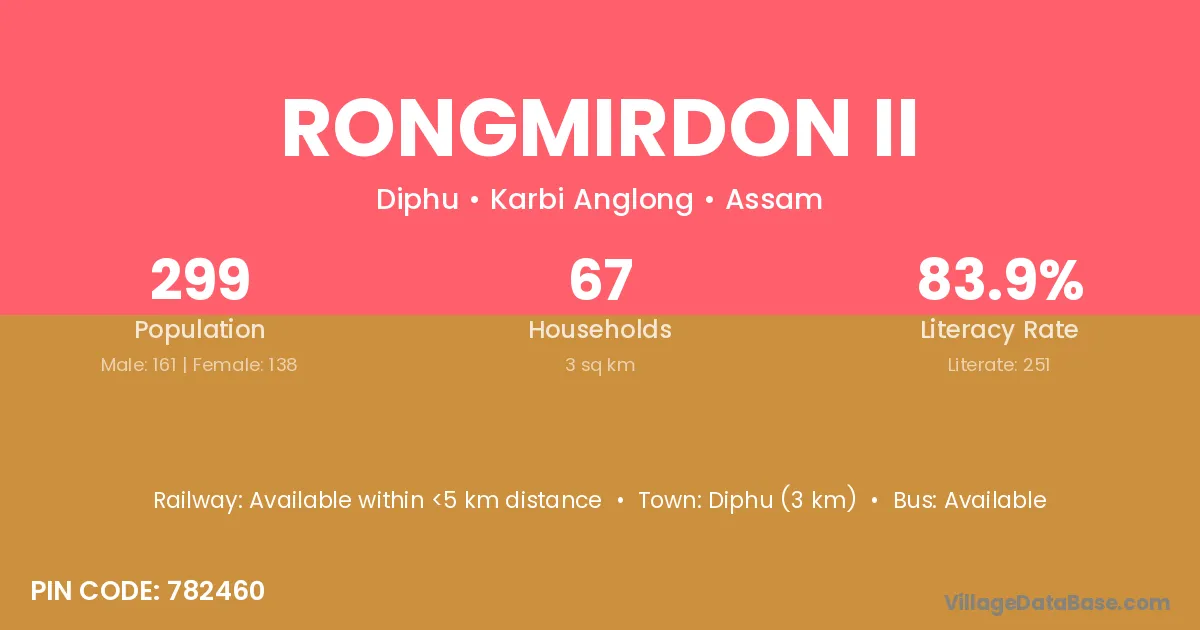 Diphu (3 km) is the nearest town to Rongmirdon Ii village for major economic activities and is located approximately 3 km away.
