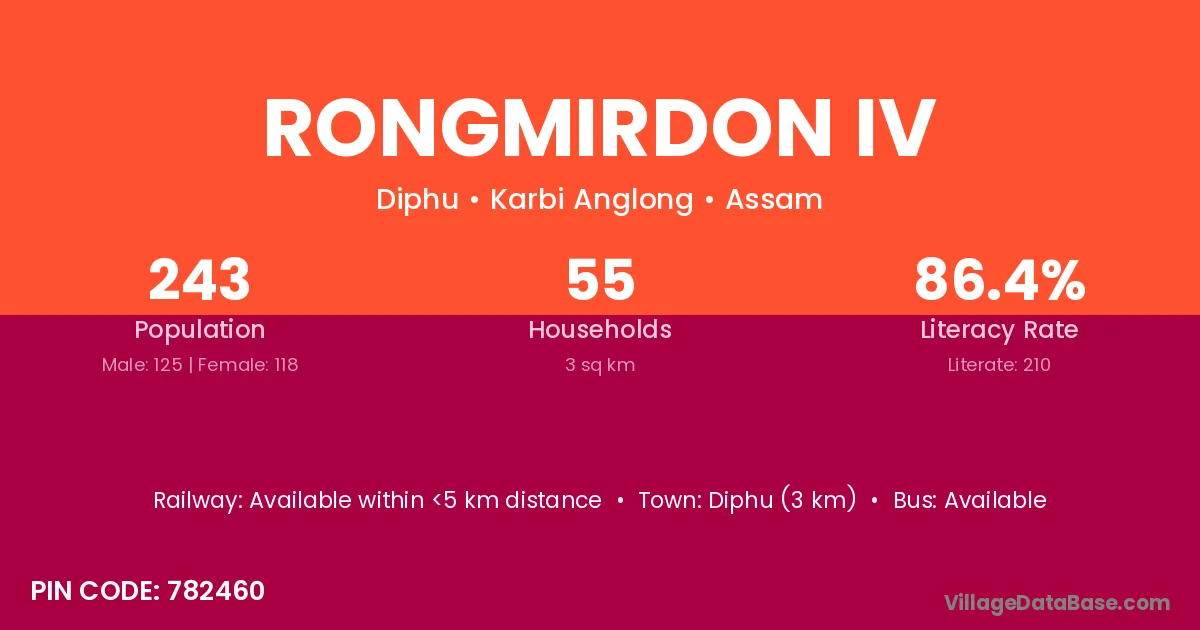 Diphu (3 km) is the nearest town to Rongmirdon Iv village for major economic activities and is located approximately 3 km away.