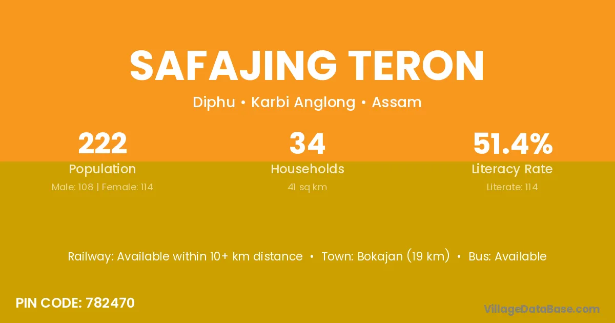 Bokajan (19 km) is the nearest town to Safajing Teron village for major economic activities and is located approximately 19 km away.
