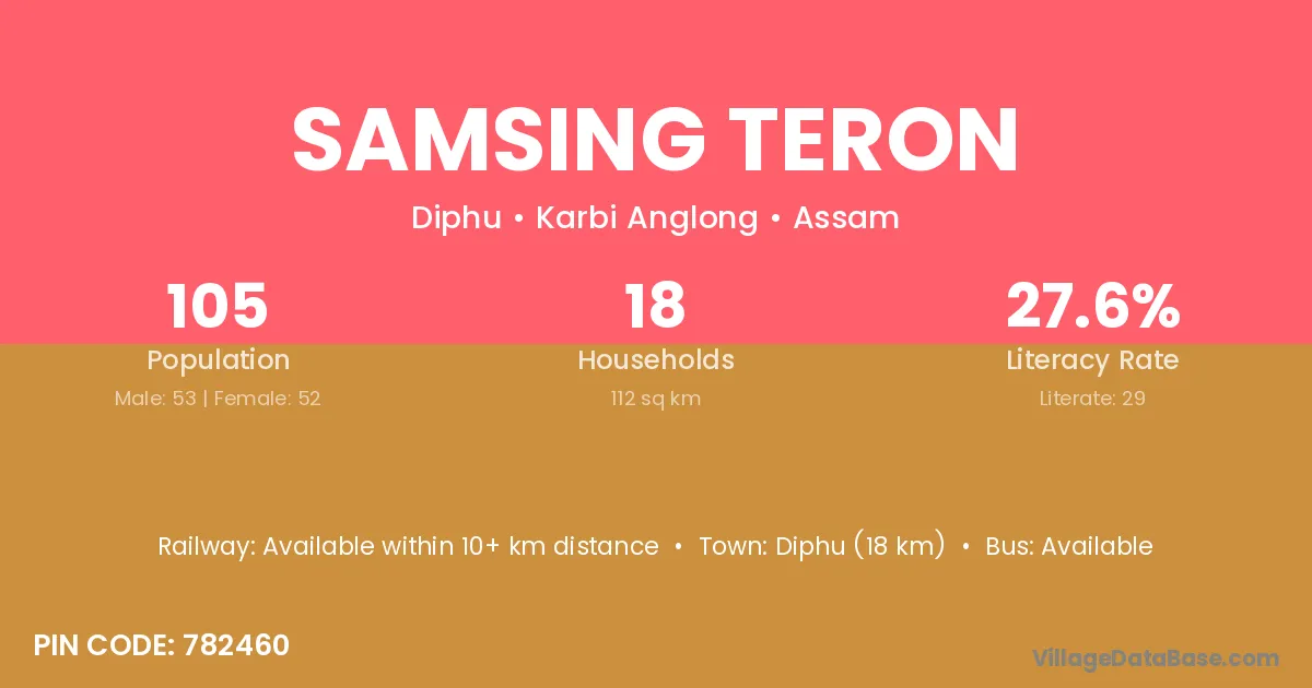 Diphu (18 km) is the nearest town to Samsing Teron village for major economic activities and is located approximately 18 km away.