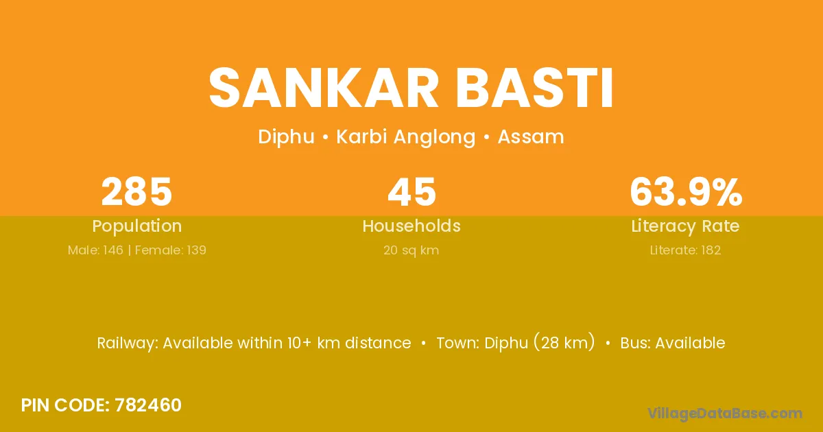 Diphu (28 km) is the nearest town to Sankar Basti village for major economic activities and is located approximately 28 km away.