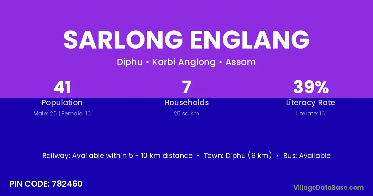 The literacy rate of Sarlong Englang village is 39.02%. Male literacy stands at 48.00% and female literacy at 25.00%.