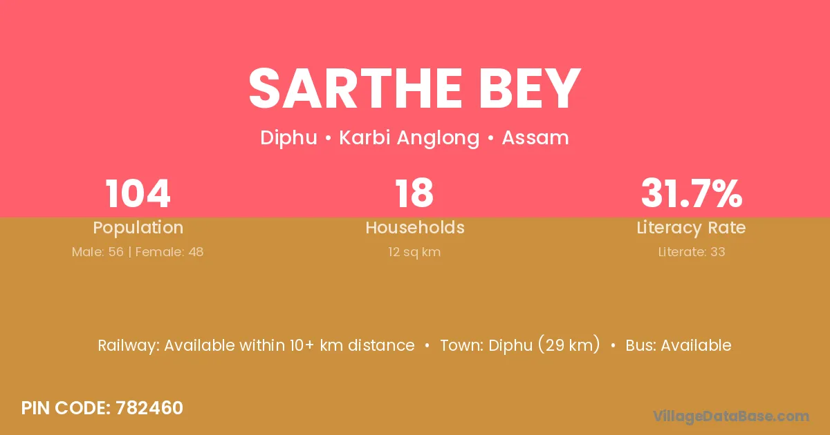 Diphu (29 km) is the nearest town to Sarthe Bey village for major economic activities and is located approximately 29 km away.