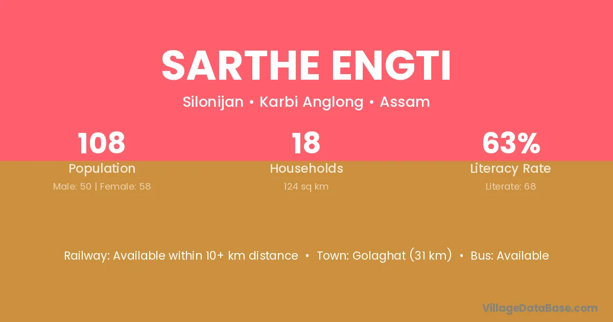 Diphu (5 km) is the nearest town to Sarthe Engti village for major economic activities and is located approximately 5 km away.
