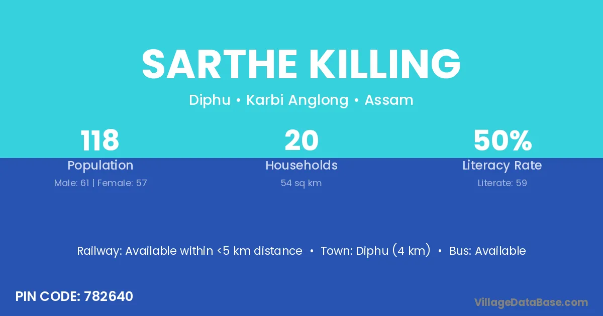 Diphu (4 km) is the nearest town to Sarthe Killing village for major economic activities and is located approximately 4 km away.