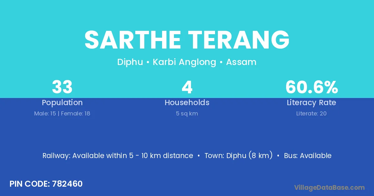 Diphu (8 km) is the nearest town to Sarthe Terang village for major economic activities and is located approximately 8 km away.
