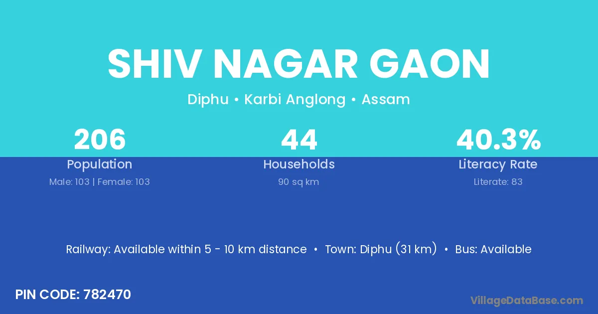 Diphu (31 km) is the nearest town to Shiv Nagar Gaon village for major economic activities and is located approximately 31 km away.