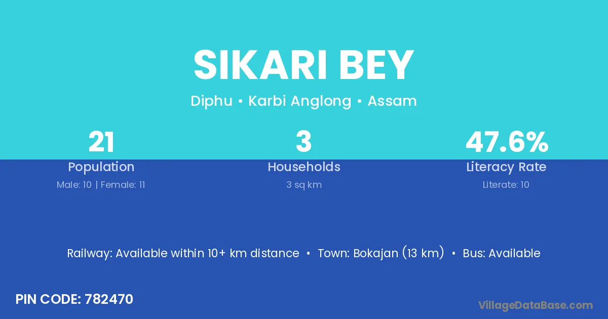 Bokajan (13 km) is the nearest town to Sikari Bey village for major economic activities and is located approximately 13 km away.