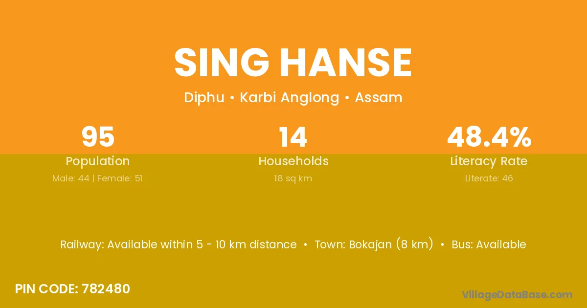 Bokajan (8 km) is the nearest town to Sing Hanse village for major economic activities and is located approximately 8 km away.