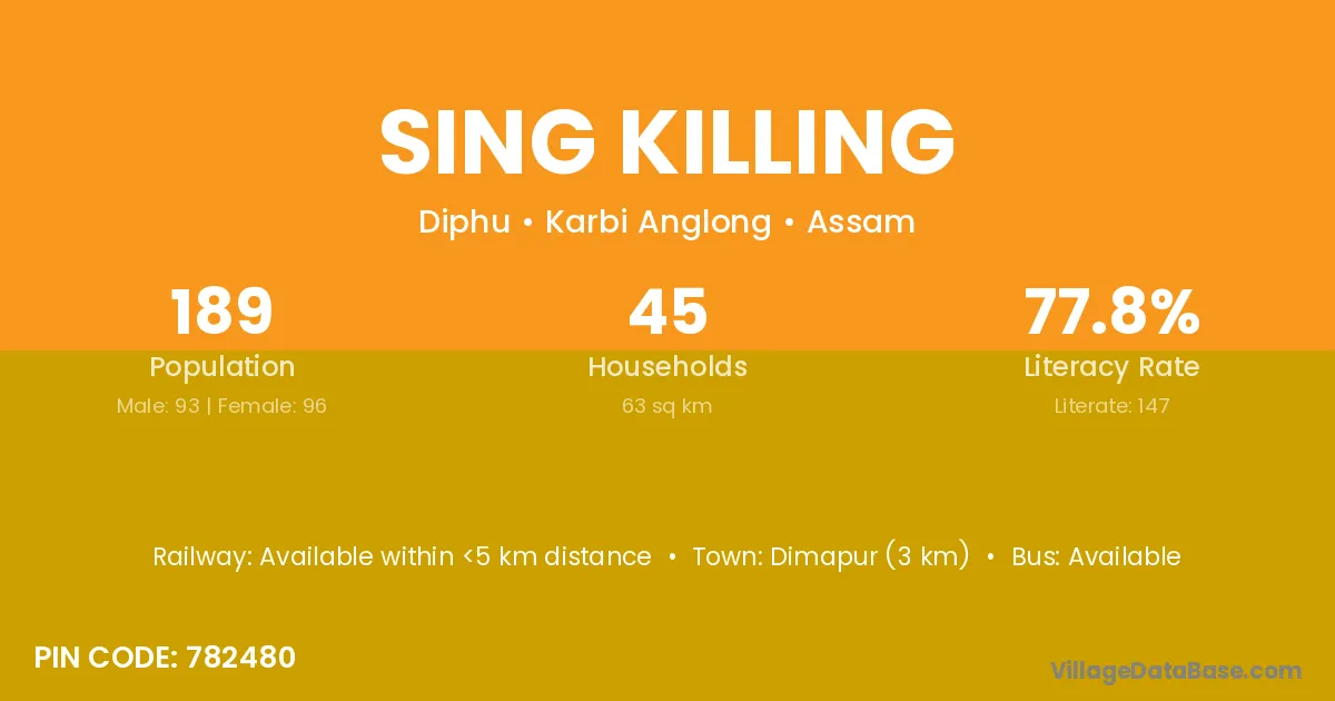 Dimapur (3 km) is the nearest town to Sing Killing village for major economic activities and is located approximately 3 km away.