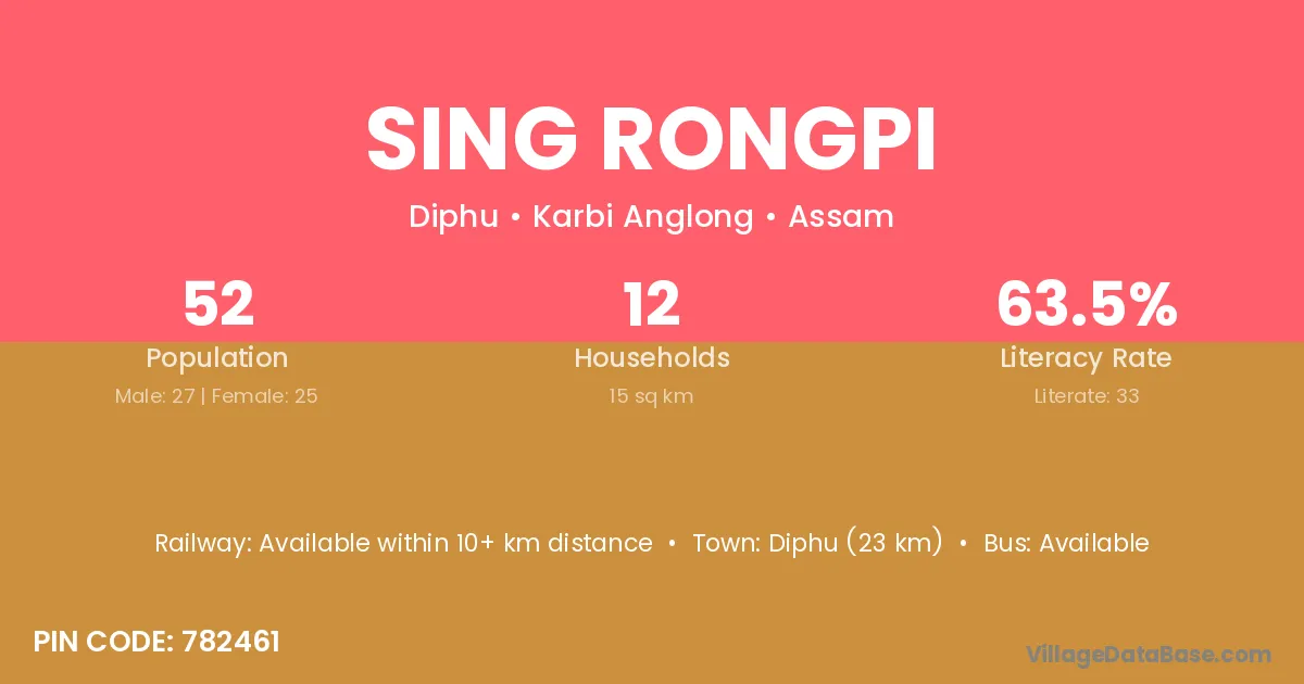Diphu (23 km) is the nearest town to Sing Rongpi village for major economic activities and is located approximately 23 km away.