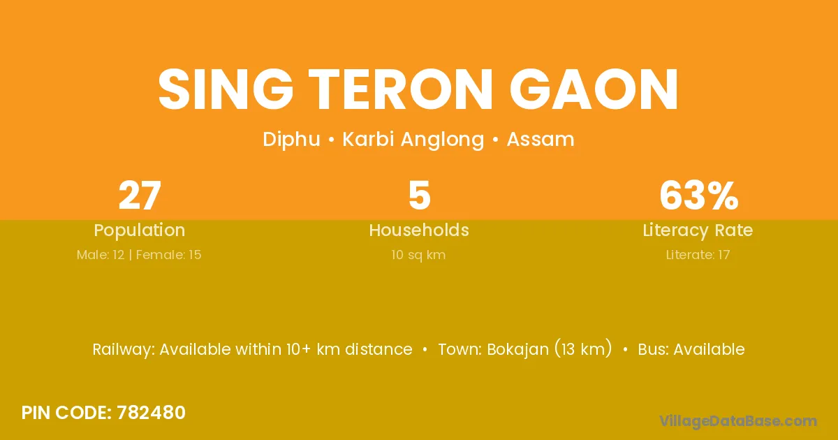 Bokajan (13 km) is the nearest town to Sing Teron Gaon village for major economic activities and is located approximately 13 km away.
