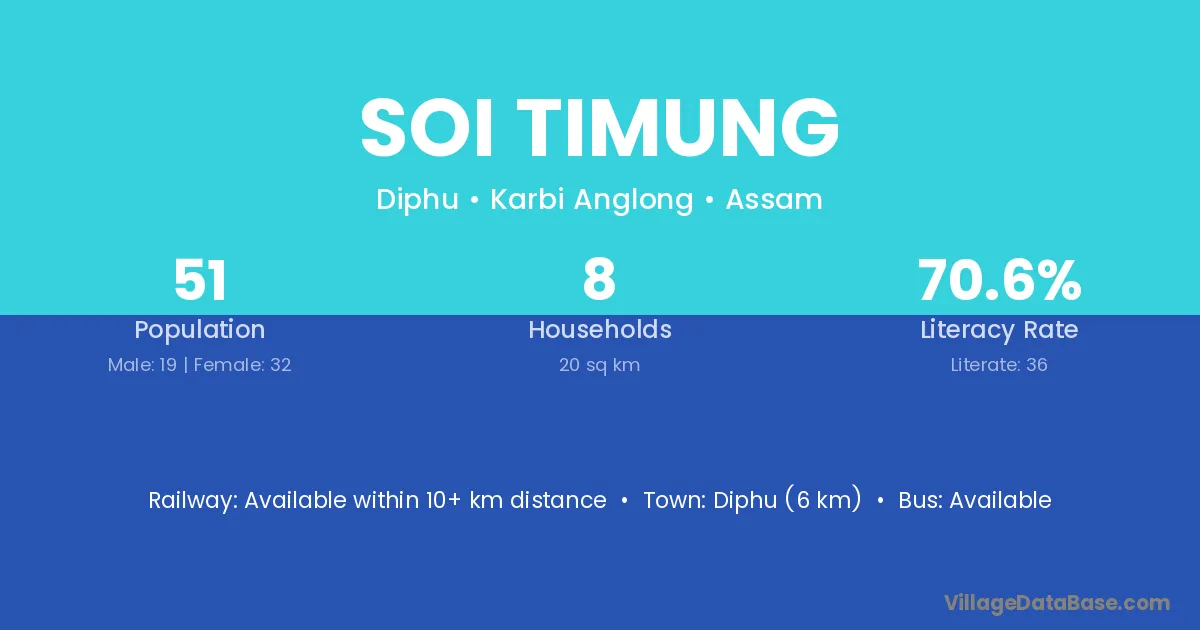 Diphu (6 km) is the nearest town to Soi Timung village for major economic activities and is located approximately 6 km away.