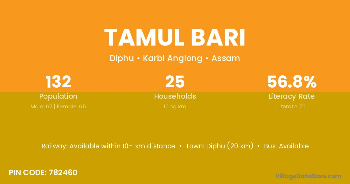 Diphu (20 km) is the nearest town to Tamul Bari village for major economic activities and is located approximately 20 km away.