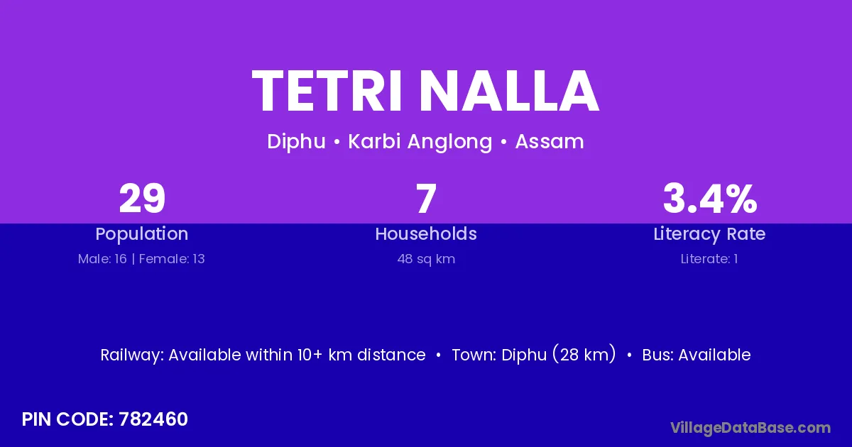 Diphu (28 km) is the nearest town to Tetri Nalla village for major economic activities and is located approximately 28 km away.